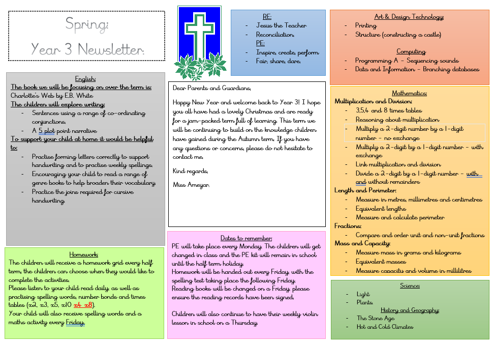 Every term Year 3 will focus their work on a topic in each subject. Please see our newsletter below that outlines the topics children will cover in the Spring term.